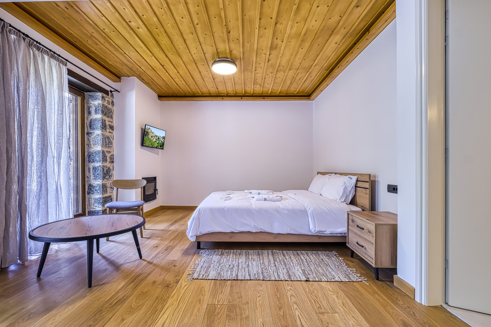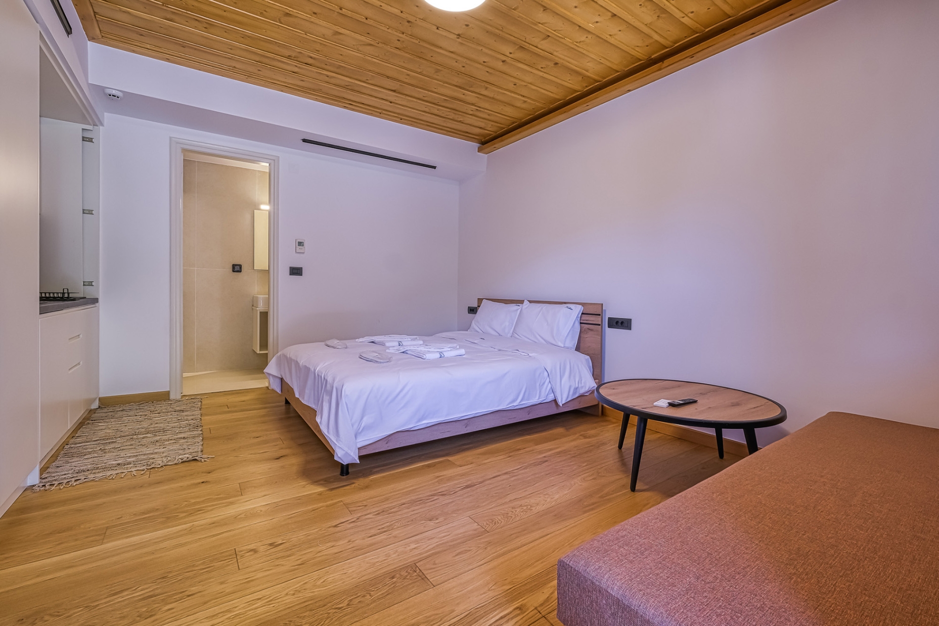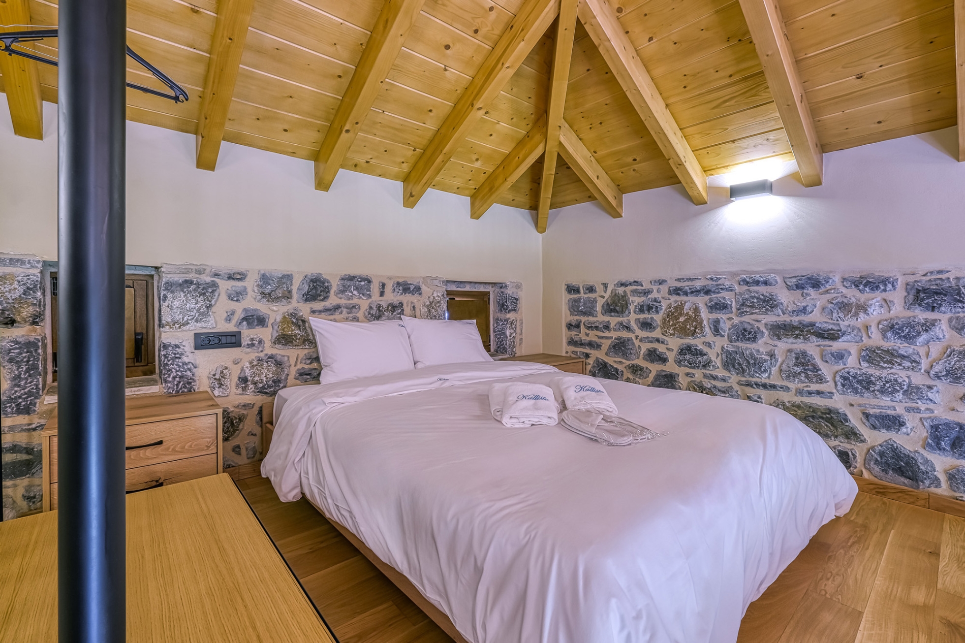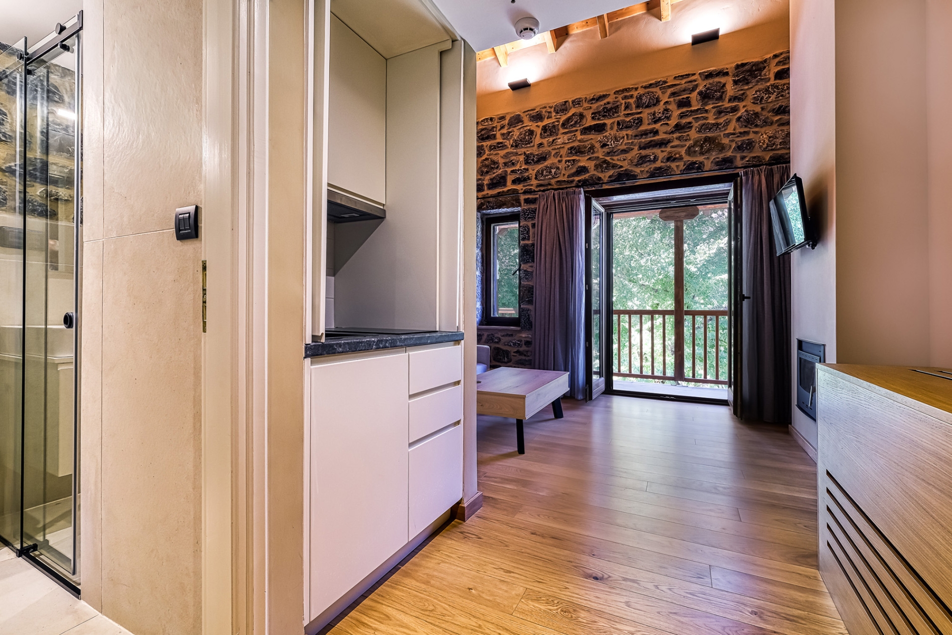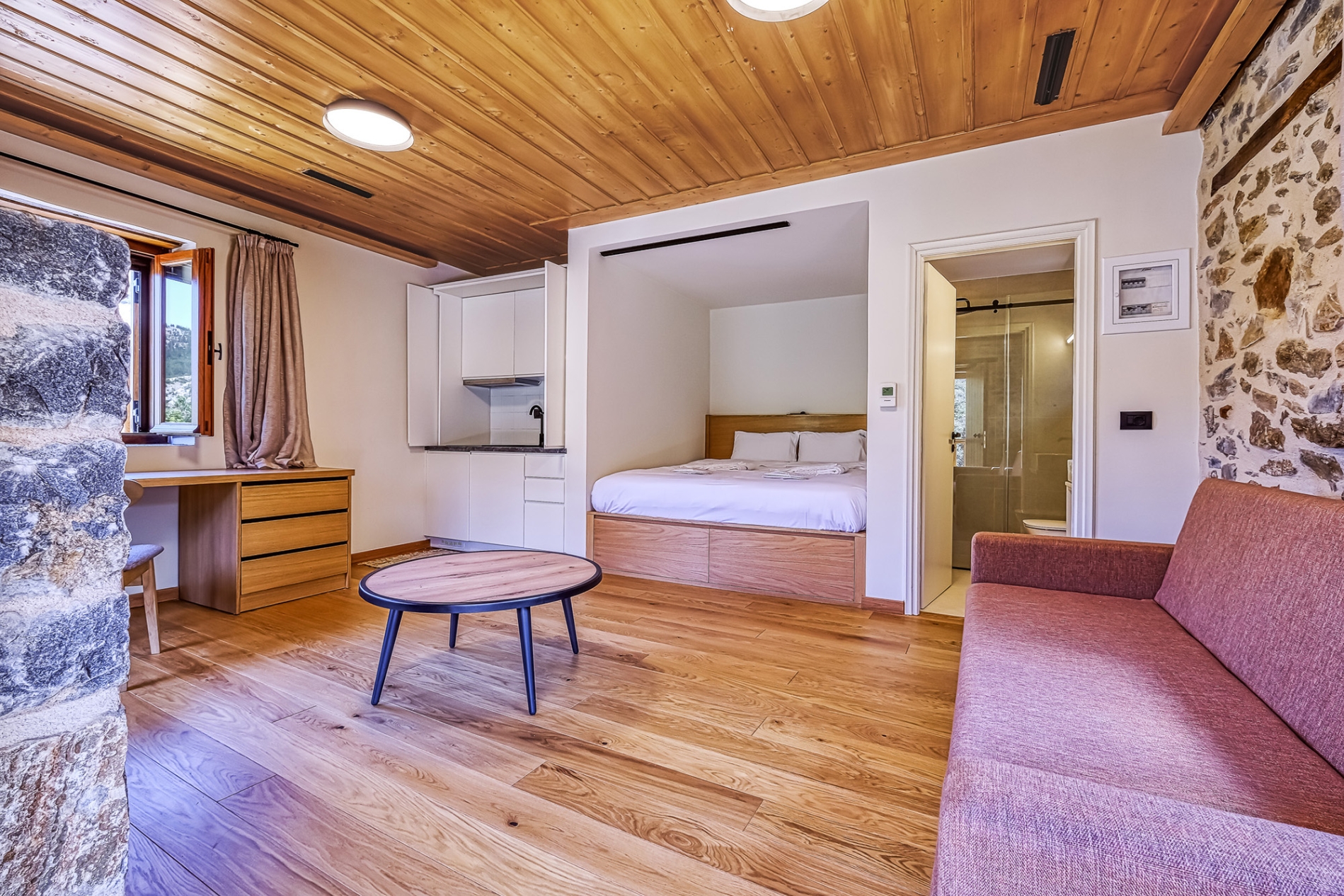 Each Double Room can accommodate up to 4 people and has an open space with a double bed, desk, sofa bed, kitchenette, fireplace and bathroom with shower cabin.